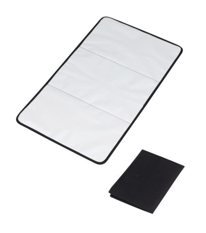 Mit der wasser- und schmutzabweisenden Wickelunterlage bist du unterwegs immer bereit, Windeln zu wechseln. Geöffnet ist sie XL, gefaltet XS.