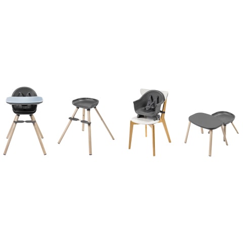 Moa ist ein 4-in-1-Mehrzweck-Hochstuhl. Er lässt sich im Laufe der Zeit von einem Hochstuhl in eine Sitzerhöhung, einen Stuhl für Kleinkinder und einen praktischen Schreibtisch mit Stuhl verwandeln.